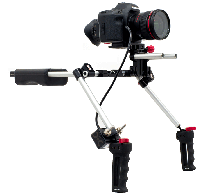 This is our own adaptation made from Zacuto parts. Simple, light weight and inexpensive for going handheld without a Camera Assistant. And it balances when you take it off your shoulder and put it down. The on/off remote switch is included. All you need for great shoulder mount handheld shots with nothing to get in the way!